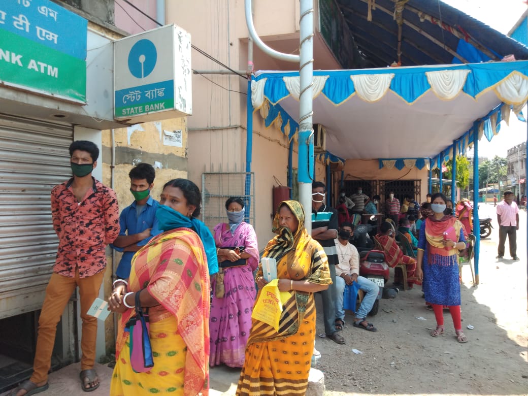মেমারি শহরেও বিভিন্ন ব্যাঙ্কে এখন মহিলারা সামাজিক দূরত্ব মেনে কেন্দ্র সরকারের এই টাকা তোলার জন্য লাইনে দাঁড়িয়েছেন। কোন কোন ব্যাঙ্ক রোদ থেকে বাঁচার জন্য ছাউনির ব্যবস্থা করেছেন।