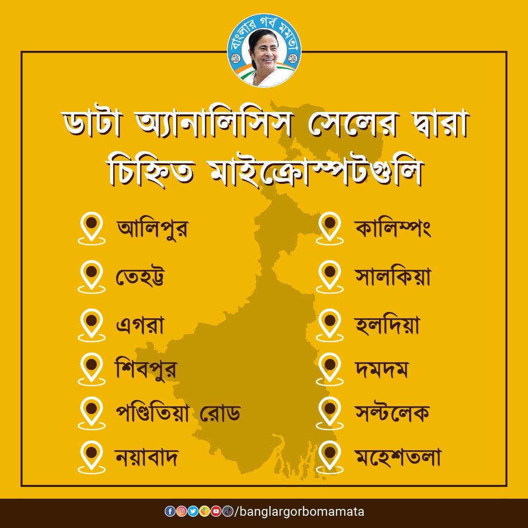 এদিন এই টুইটে প্রকাশ্যে এসেছে রাজ্যের যে ১২টি্ মাইক্রোস্পট, সেগুলি হল- আলিপুর, তেহট্ট, এগরা, শিবপুর, পণ্ডিতিয়া রোড, নয়াবাদ, কালিম্পং, সালকিয়া, হলদিয়া, দমদম, সল্টলেক ও মহেশতলা। ডাটা অ্যানালিসিস সেলের দ্বারা এই স্পটগুলি চিহ্নিত করা হয়েছে।