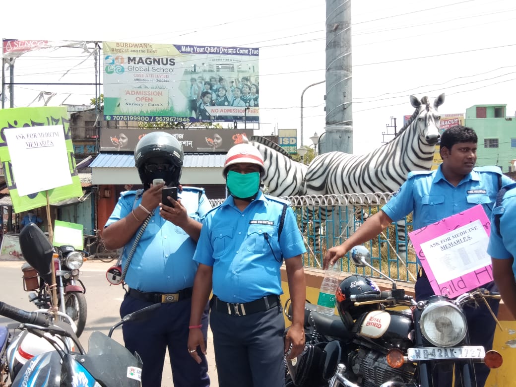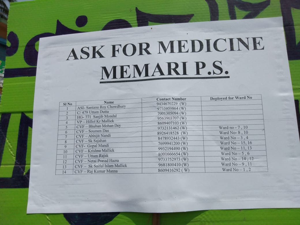 মেমারি শহরে লকডাউনের ফলে দেখা যাচ্ছে কিছু গৃহবন্দী থাকা বয়স্ক মানুষ, অসহায় মহিলা, অভিভাবকহীন রোগী, প্রতিবন্ধী মানুষ ঔষধ কিনতে বাড়ির বাইরে আসতে পারছেন না এমতাবস্থায় পূর্ব বর্ধমান জেলা পুলিশে তত্বাবধানে মেমারি থানার ওসি সুদীপ্ত মুখার্জীর নির্দেশে এ.এস.আই শান্তনু রায় চৌধুরীর নেতৃত্বে একটি মেডিকেল পরিষেবা টিম গঠন করল। ১৪ জনের এই টিমে হোমগার্ড, ভিপি, সিভিক পুলিশ তাদের হোয়াটসঅ্যাপে প্রেসক্রিপসনের ছবি পাঠালে এবং ঔষধ দোকানের নাম বলে দিলে সেখান থেকেই পুলিশ কর্মীরা বাড়িতে ঔষধ পৌঁছে দেবেন বলে জানা গেছে। এই মর্মে আজ মেমারি শহরজুড়ে পুলিশ প্রচার অভিযান চালায়।