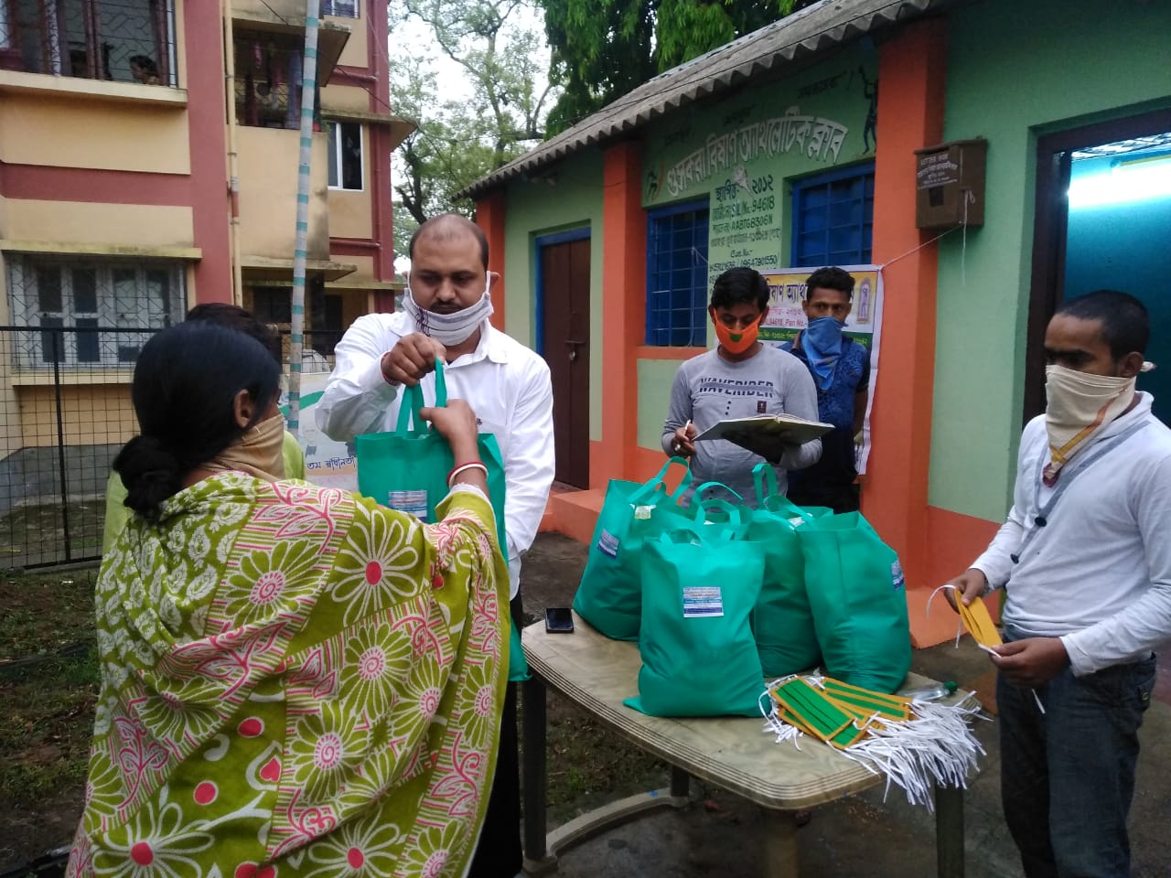 স্টাফ রিপোর্টার, গুসকরাঃ গুসকরা বিষাণ অ্যাথ্লেটিক ক্লাবের পক্ষ থেকে আজ শুভ অক্ষয় তৃতীয়ার দিনে নভেল করোনা ভাইরাস প্রতিরোধে, রেলওয়ে হকার, বাস স্ট্যান্ডের হকার এবং গুসকরার বিভিন্ন ওয়ার্ডের (১,২,৩,৬,৭,৯,১০, ১১,১২,১৩,১৫ নং ওয়ার্ড) নিম্ন মধ্যবিত্ত ২৫০ টি পরিবার গুলির হাতে চাল, ডাল, নুন, তেল, আলু, মুড়ি, সোয়াবিন, মাস্ক, সাবান একটি পরিবেশ বান্ধব ব্যাগের মধ্যে ভরে তুলে দেওয়া হল । প্রত্যেকে নভেল করোনা ভাইরাস প্রতিরোধ সম্পর্কে সরকারি নির্দেশিকা যথাযথ ভাবে পালন করার জন্য আহ্বান জানালেন এবং আগামী দিনেও মানুষের পাশে থাকার অঙ্গীকার করেছেন ক্লাবের সম্পাদক, সৌগত গুপ্ত ।