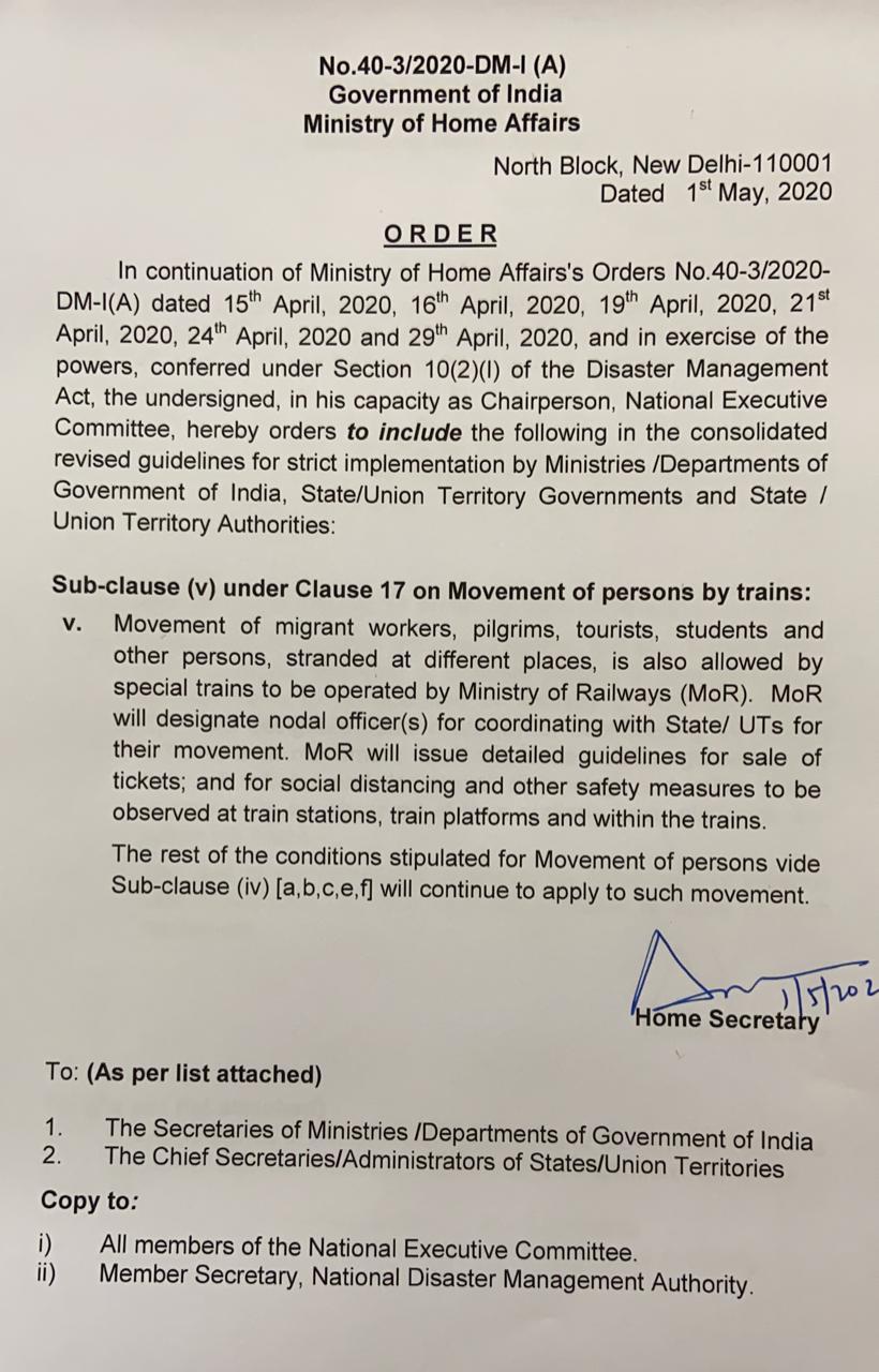 বিশেষ সংবাদঃ পরিযায়ী শ্রমিক, শিক্ষা ও চিকিৎসার জন্য যারা বিভিন্ন রাজ্যে আটকে আছেন তাদের ফেরানোর ব্যপারে স্বরাষ্ট্র মন্ত্রক প্রথমে সড়কপথে বাসে আসার আনুমতি দিয়েছিল কিন্তু কিছু রাজ্য সড়কপথে বাসে আনা অনেক ঝুঁকিপূর্ণ বলে স্পেশাল ট্রেনের দাবী করেছিলেন। আজ এক নোটিফিকেশনে ট্রেনে নিয়ে আসার অনুমতি দিল স্বরাষ্ট্রমন্ত্রক এবং তার সাথে রাজ্যকে ঠিক করতে বললেন তার পরিকল্পনা কি হবে।