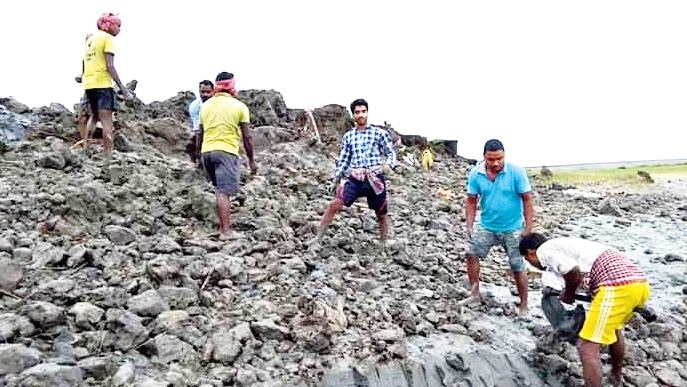 সন্দেশখালিতে আবার অন্যদৃশ্য। ভেঙে যাওয়া বাঁধ সংস্কার করতে সরকারের অপেক্ষা না করে কয়েকশো মানুষ নিজেরাই বাঁধ মেরামতের কাজে হাত লাগিয়েছে। নাহলে প্রায় ১০০ গ্রাম ভেসে যাবে।