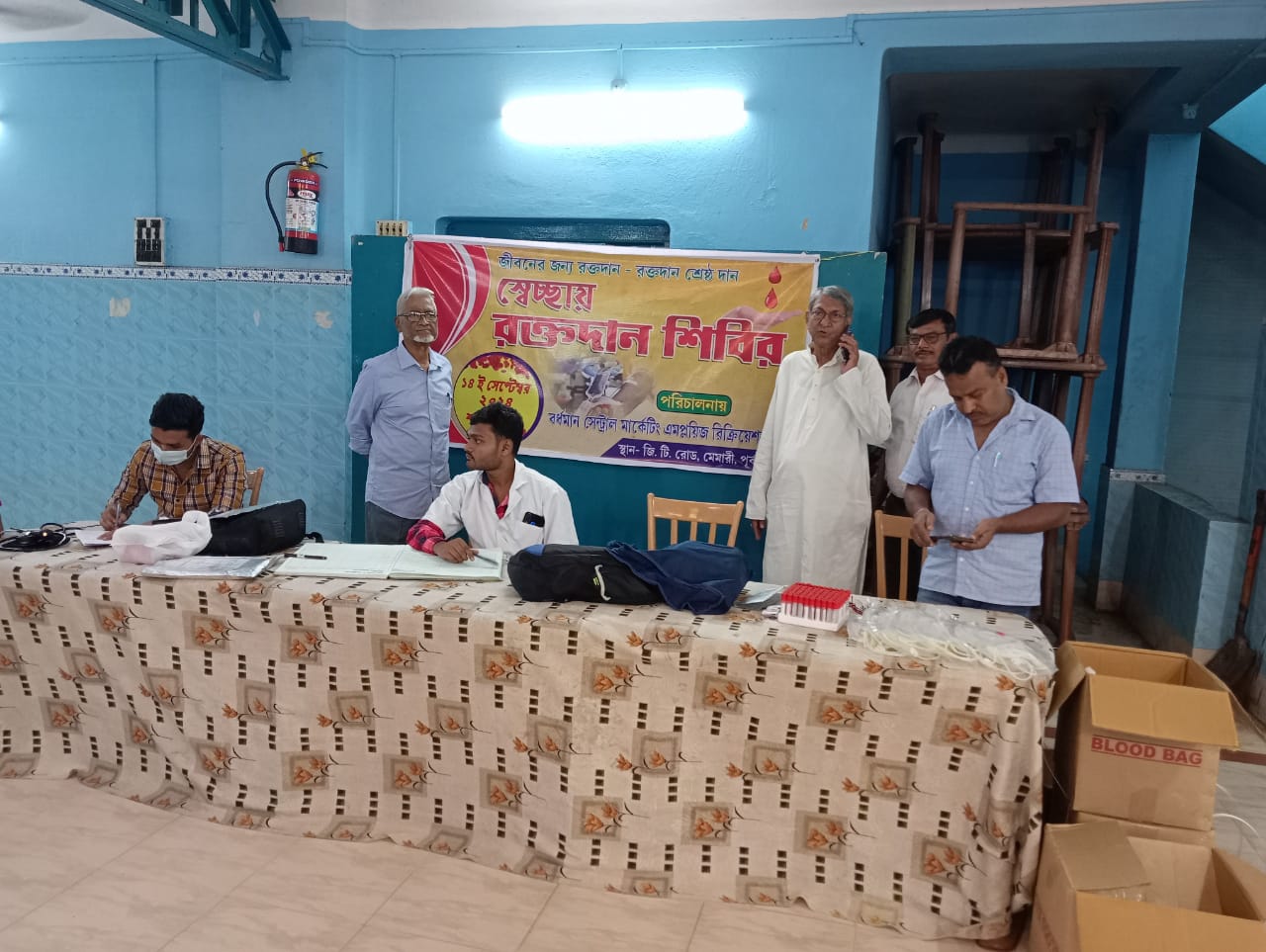 বর্ধমান সেন্ট্রাল মার্কেটিং এমপ্লয়িজ রিক্রিশন ক্লাবের উদ্যোগে। শনিবার মেমারি সৃষ্টি লজে প্রতি বছরের ন্যায় এবছরও শ্রীশ্রী বিশ্বকর্মা পূজা উপলক্ষে স্বেচ্ছায় রক্তদান শিবির হয়। শিবিরে দুই জন মহিলা সহ মোট ৪৮ স্বেচ্ছায় রক্তদান করেন। শিবিরে উপস্থিত ছিলেন বর্ধমান সেন্ট্রাল কো অপারেটিভ এগ্রিকালচারাল প্রোডাক্টস এণ্ড মার্কেটিং সোসাইটি লিমিটেডের চেয়ারম্যান তথা মেমারি বিধানসভার বিধায়ক মধুসূধন ভট্টাচার্য্য, সৈয়দ নাসিরুদ্দিন আহম্মেদ, তপন গন ও অন্যান্য ব্যাক্তি বিশিষ্ট ব্যাক্তিবর্গ।