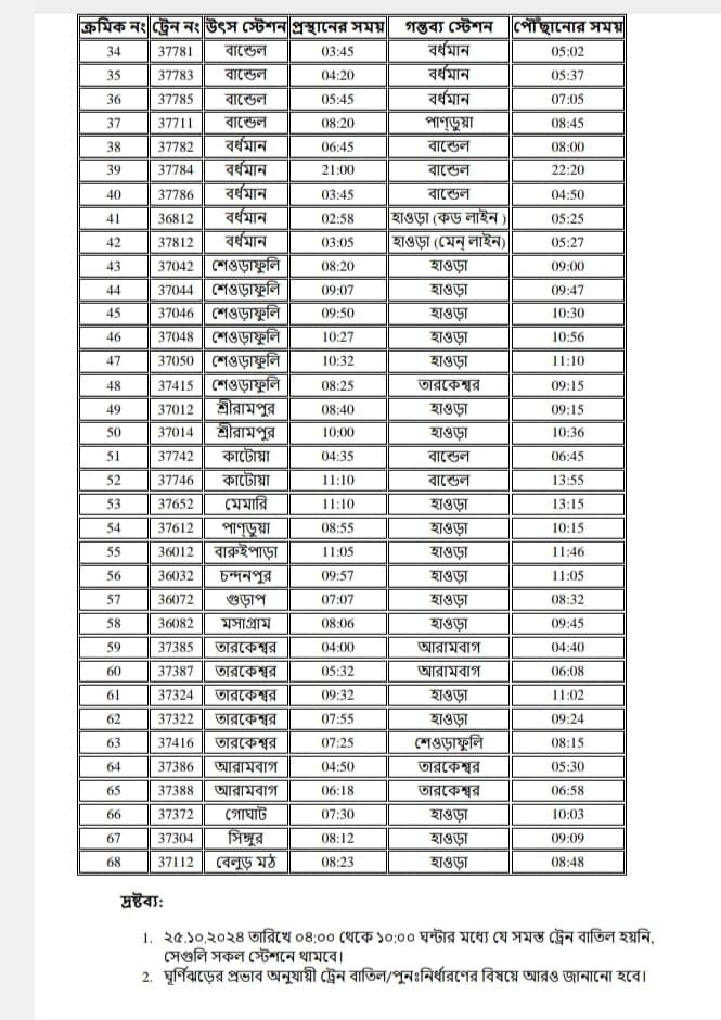 ঘূর্ণিঝড়ের আশঙ্কায় বাতিল ৬৮ লোকাল ট্রেনঃ জেনে নিন হাওড়া থেকে  টাইমটেবিল-সহ পুরো তালিকা