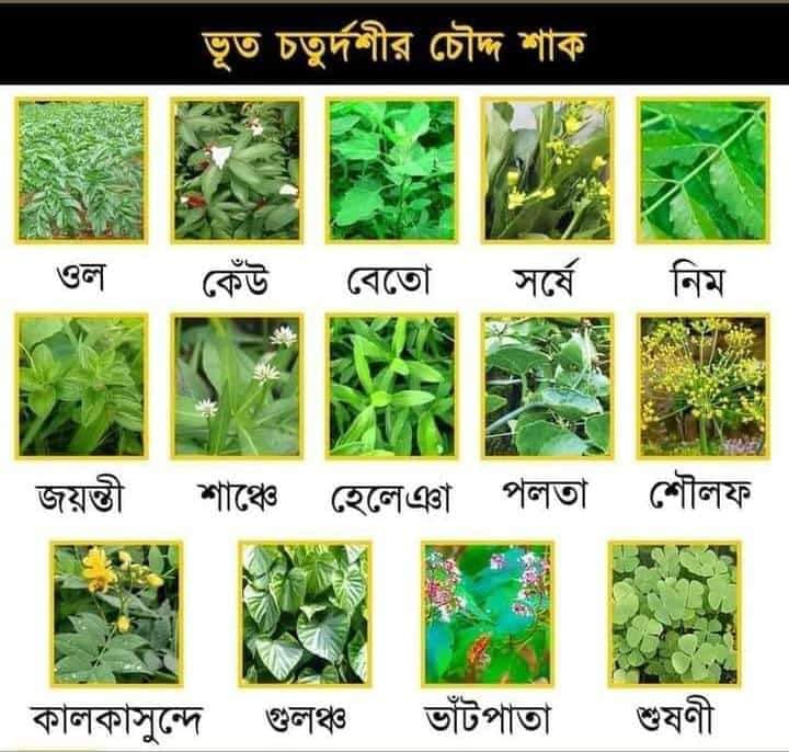 একইসঙ্গে প্রতিটি বাড়ির মূল প্রবেশ পথে ঐদিন মাটির প্রদীপ জ্বালিয়ে দেওয়া হয় যা যমরাজের উদ্দেশ্যে। মানুষের বিশ্বাস এই দিন কোন ধাতব দ্রব্য কিনলে তা পরিমাণে তেরো গুণ বৃদ্ধি পায়। এই ধারণা থেকেই ধনতেরাসে সোনা কেনার প্রচলন হয়েছে। নরক চতুর্দশী বা ভূত চতুর্দশী দীপান্বিতা অমাবস্যার আগের দিন অর্থাৎ কার্তিক মাসের কৃষ্ণপক্ষের চতুর্দশী তিথি হল ভূত চতুর্দশী। সেদিন চোদ্দ ভুবনের অধীশ্বরী দেবীর উদ্দেশ্যে ১৪ দীপ দান করা হয় এবং চোদ্দ শাক খাওয়ার রীতি রয়েছে। এই চোদ্দ শাক হল- ১) ওল, ২) কেঁউ, ৩) বেতো, ৪) সর্ষে, ৫) কালকাসুন্দে, ৬) নিম, ৭) জয়ন্তী, ৮) শাঞ্চে, ৯) হেলেঞ্চা, ১০) পলতা, ১১) শুলফা, ১২) গুলঞ্চ, ১৩) ভাঁট পাতা, ১৪) শুষনি শাক।