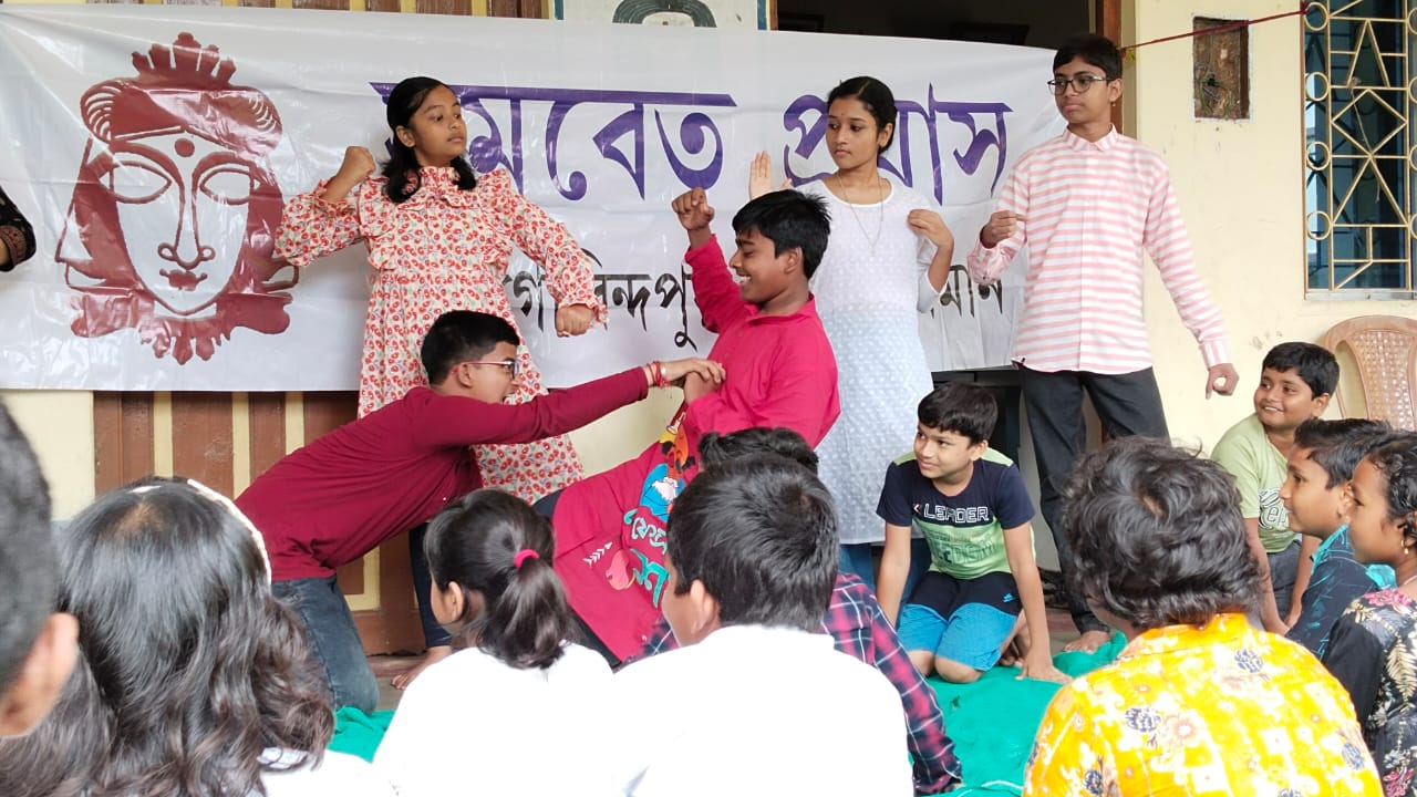 ঠিক এই জটিল পরিস্থিতিতে বর্ধমান শহর থেকে কয়েক কিমি দূরে অবস্থিত হাটগোবিন্দপুরের ‘সমবেত প্রয়াস’ নামক নাট্য ও সাংস্কৃতিক গোষ্ঠী তাদের রজত জয়ন্তী বর্ষে এক অভিনব উদ্যোগ গ্রহণ করে। গত ২৪ শে অক্টোবর সংস্থার ২৬ তম প্রতিষ্ঠা দিবস উপলক্ষ্যে ৫-১৫ বছরের কিশোর-কিশোরীদের জন্য আয়োজন করে নাটকের কর্মশালা।