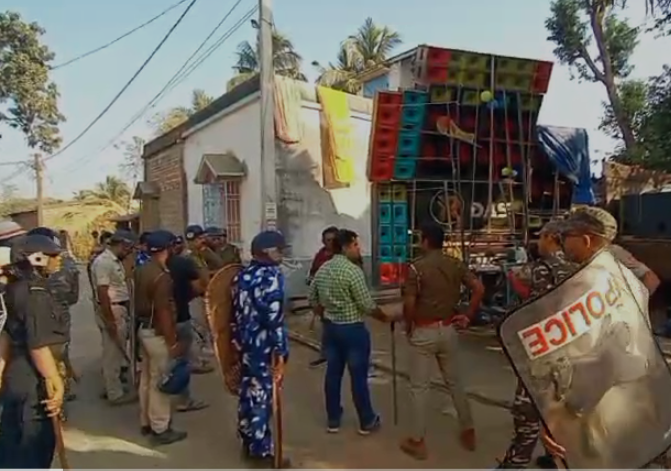 অভিযোগ,পুলিশ কয়েকটি মাইক সেট বন্ধ করে দিলে পুলিশকে ঘিরে বিক্ষোভ দেখাতে থাকে কয়েকটি পুজো কমিটি।