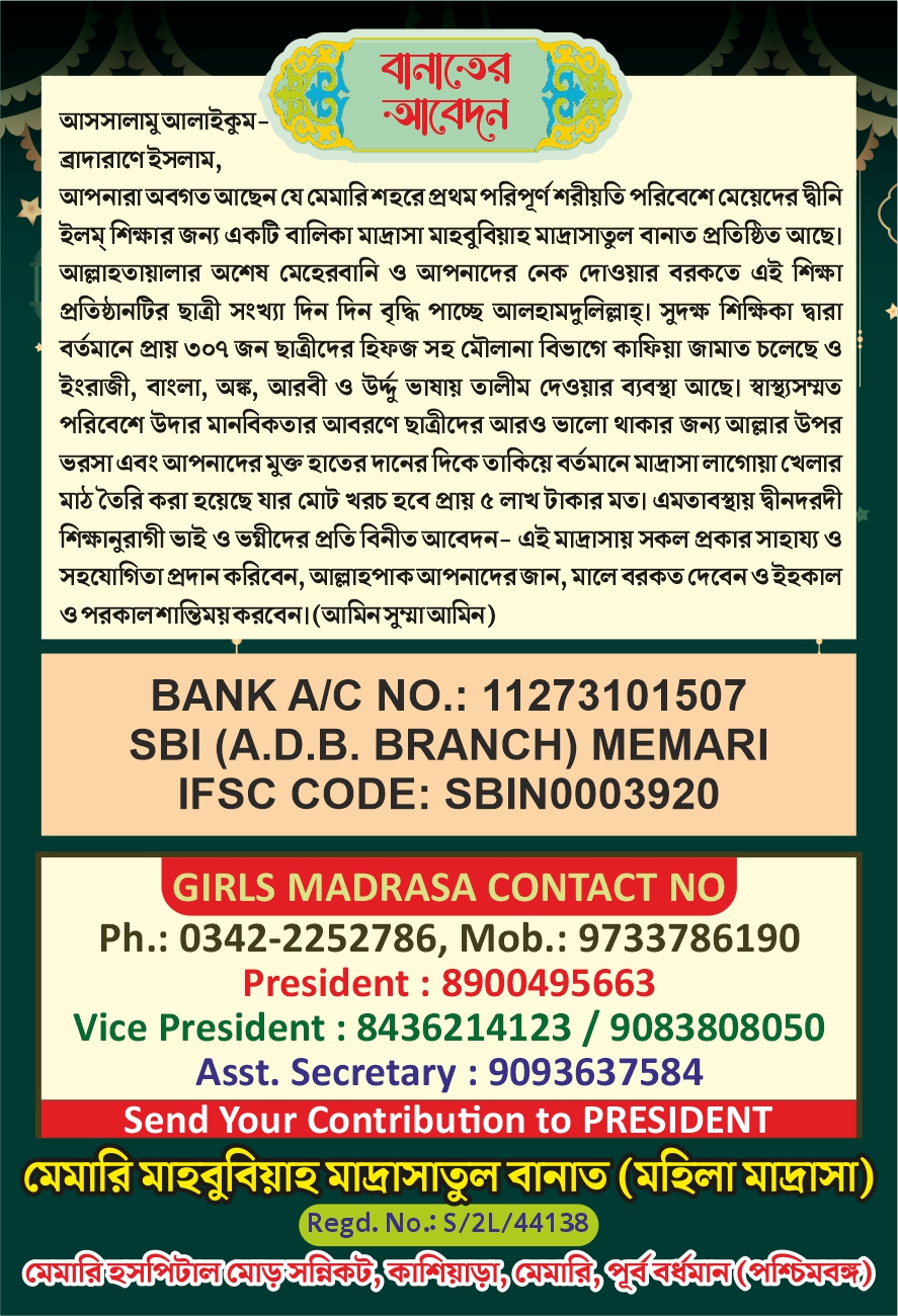 ইসলামে নারী শিক্ষার গুরুত্ব অপরিসীম। ব্যক্তি পরিবার সমাজ ও রাষ্ট্রের উন্নয়নে নারীশিক্ষার বিকল্প নেই। বিশেষ করে একটি পরিবারকে সুশিক্ষিত করে তুলতে হলে শিক্ষাক্ষেত্রে নারীকে অবশ্যই অগ্রাধিকার দিতে হবে। আর সেই ইসলাম জ্ঞানের আলোকবর্তিকা দিকে দিকে ছড়িয়ে দিচ্ছে মেমারি মাহাবুবিয়াহ মাদ্রাসাতুন বানাত -বালিকা মাদ্রাসা।