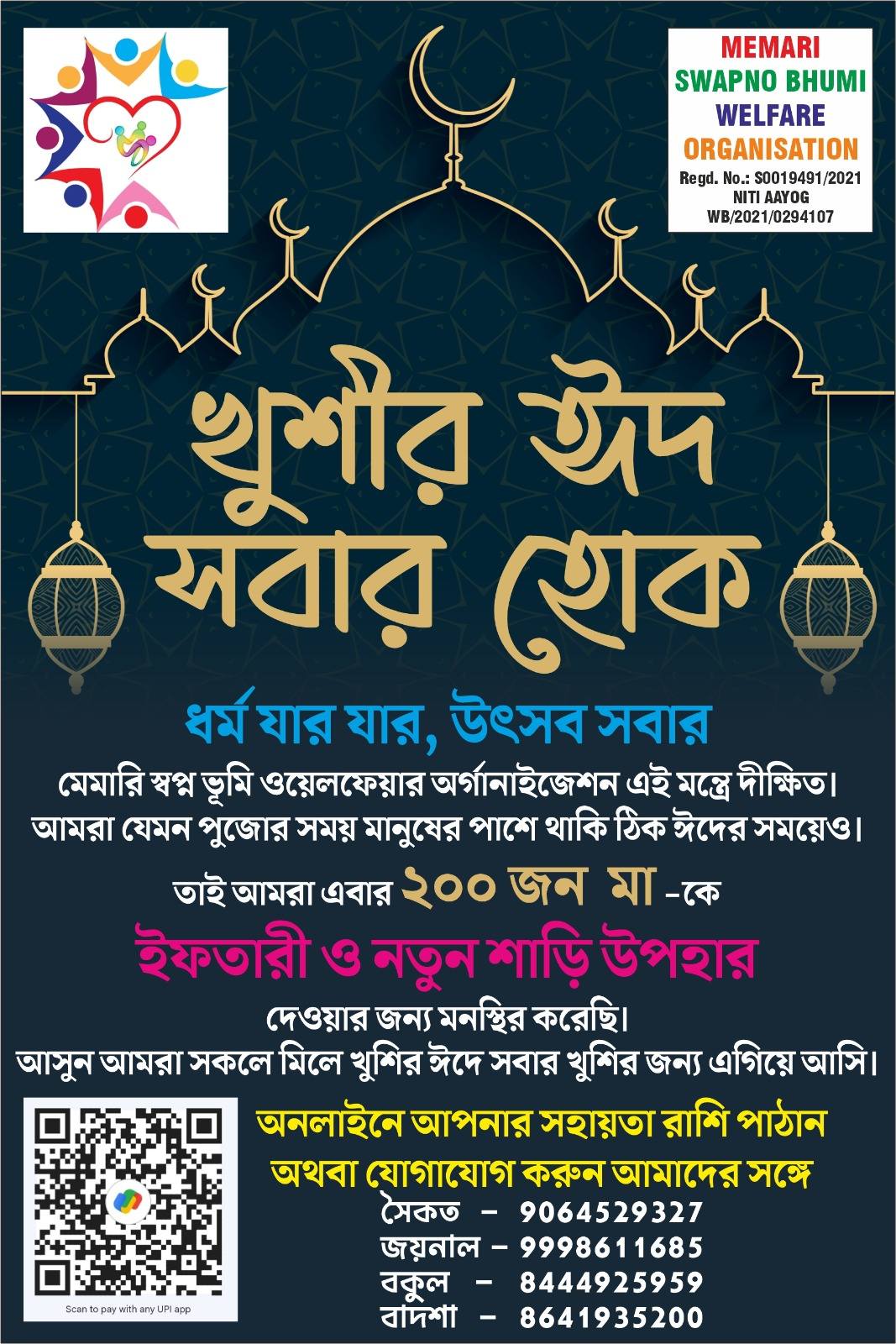 মেমারি স্বপ্নভূমি ওয়েলফেয়ার অর্গানাইজেশনের পক্ষ থেকে জানানো হয়, ধর্ম যার যার উৎসব সবার এই মন্ত্রে দীক্ষিত তাঁদের সদস্যরা। তাই খুশীর ঈদ হোক সবার এই কর্মসূচীর মাধ্যমে একদিকে যেমন রোজদারদের ইফতার সামগ্রী প্রদান করা হচ্ছে অন্যদিকে ২০০ জন মা কে নতুন শাড়ি উপহার দেওয়া হবে।