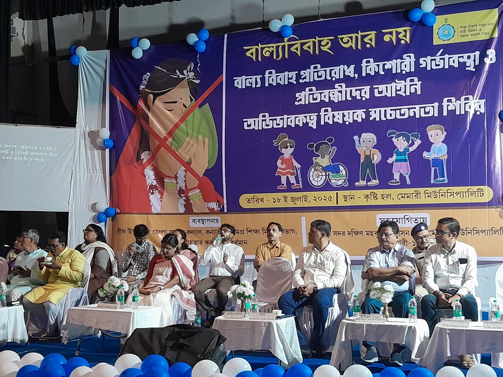 পূর্ব বর্ধমান জেলা সমাজ কল্যাণ, কন্যাশ্রী ও সমগ্র শিক্ষা মিশন বিভাগের যৌথ উদ্যোগে এবং বর্ধমান সদর দক্ষিন মহাকুমা প্রশাসন, মেমারি পৌরসভা ও মেমারি ১ ব্লকের সহযোগিতায় বাল্য বিবাহ প্রতিরোধ, কিশোরী গর্ভাবস্থা ও প্রতিবন্ধীদের আইনি অভিভাবকত্ব বিষয়ক সচেতনতা শিবিরে উপস্থিত ছিলেন পূর্ব বর্ধমান জেলা শাসক আয়েষা রাণী, এসডিও বুদ্ধদেব পান, মেমারি পৌরসভার চেয়ারম্যান স্বপন বিষয়ী, মেমারি বিধানসভার বিধায়ক মধুসূদন ভট্টাচার্য, জামালপুর বিধানসভার বিধায়ক অলোক কুমার মাঝি, রায়না বিধানসভার বিধায়ক শম্পা ধারা সহ অন্যান্য প্রশাসনিক আধিকারিকরা।