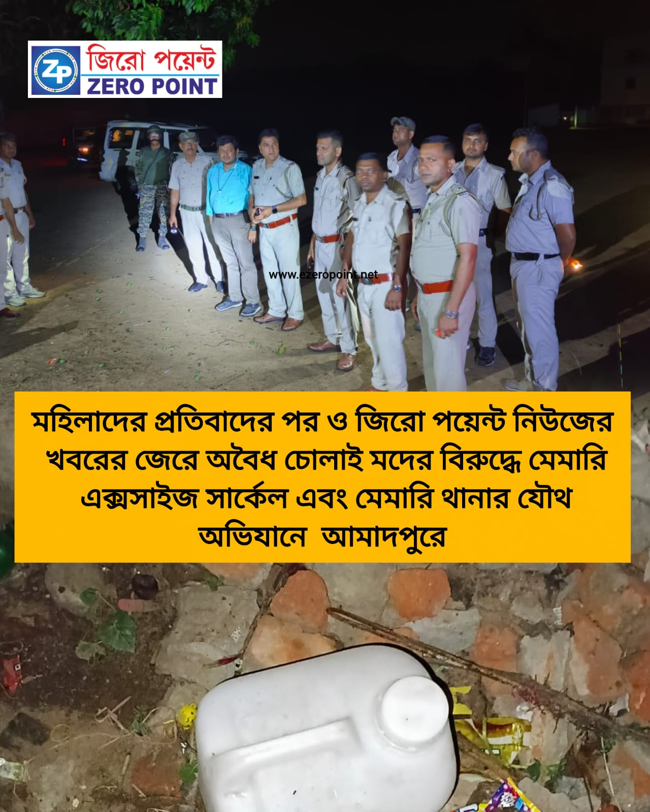 ২৪ ঘন্টার মধ্যেই জিরো পয়েন্টের খবরের জেরে ও আমাদপুরের মহিলাদের প্রতিবাদে নড়েচড়ে বসলো প্রশাসন। আমাদপুরের পাড়ায় পাড়ায় মদের ভাটি, ছাত্র যুবসমাজ থেকে এলাকার মানুষকে বাঁচাতে প্রতিবাদে মহিলারা গত সোমবার সন্ধ্যায় জড়ো হয়েছিলো। এমনকি মেমারি থানায় অভিযোগও করা হয়েছিলো। আর তারপরই অ্যাকশন মুডে পুলিশ প্রশাসন।